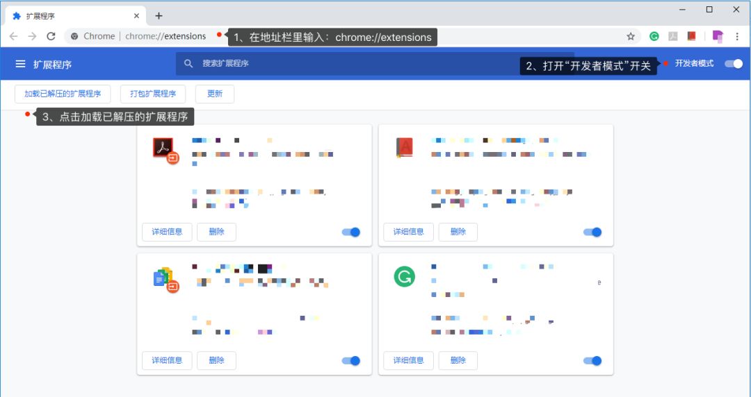 启动Chrome浏览器,在地址栏中输入:chrome://extensions/,打开页面右上角的“开发者模式开关”,点击页面左上角的“加载已解压的扩展程序”